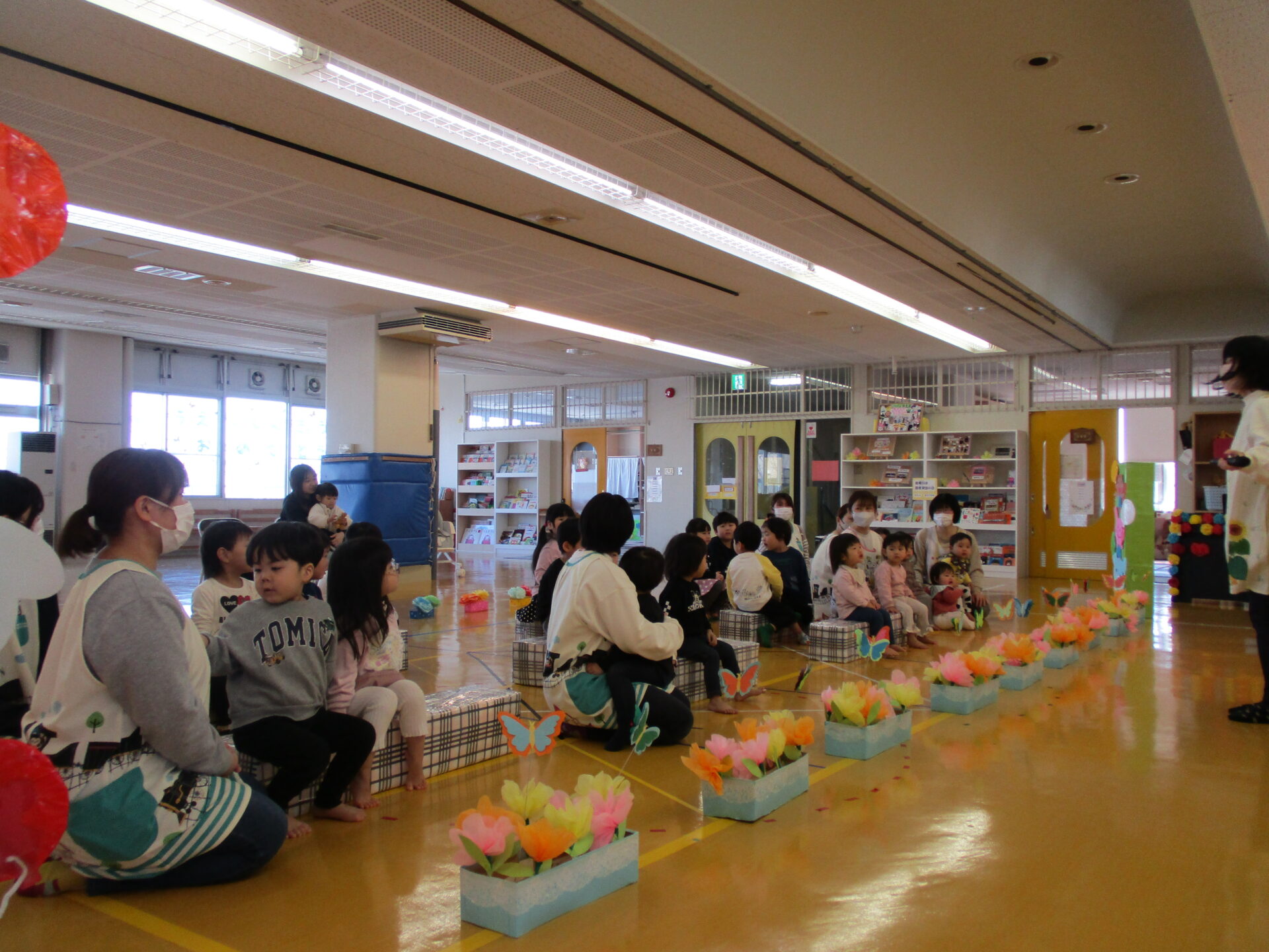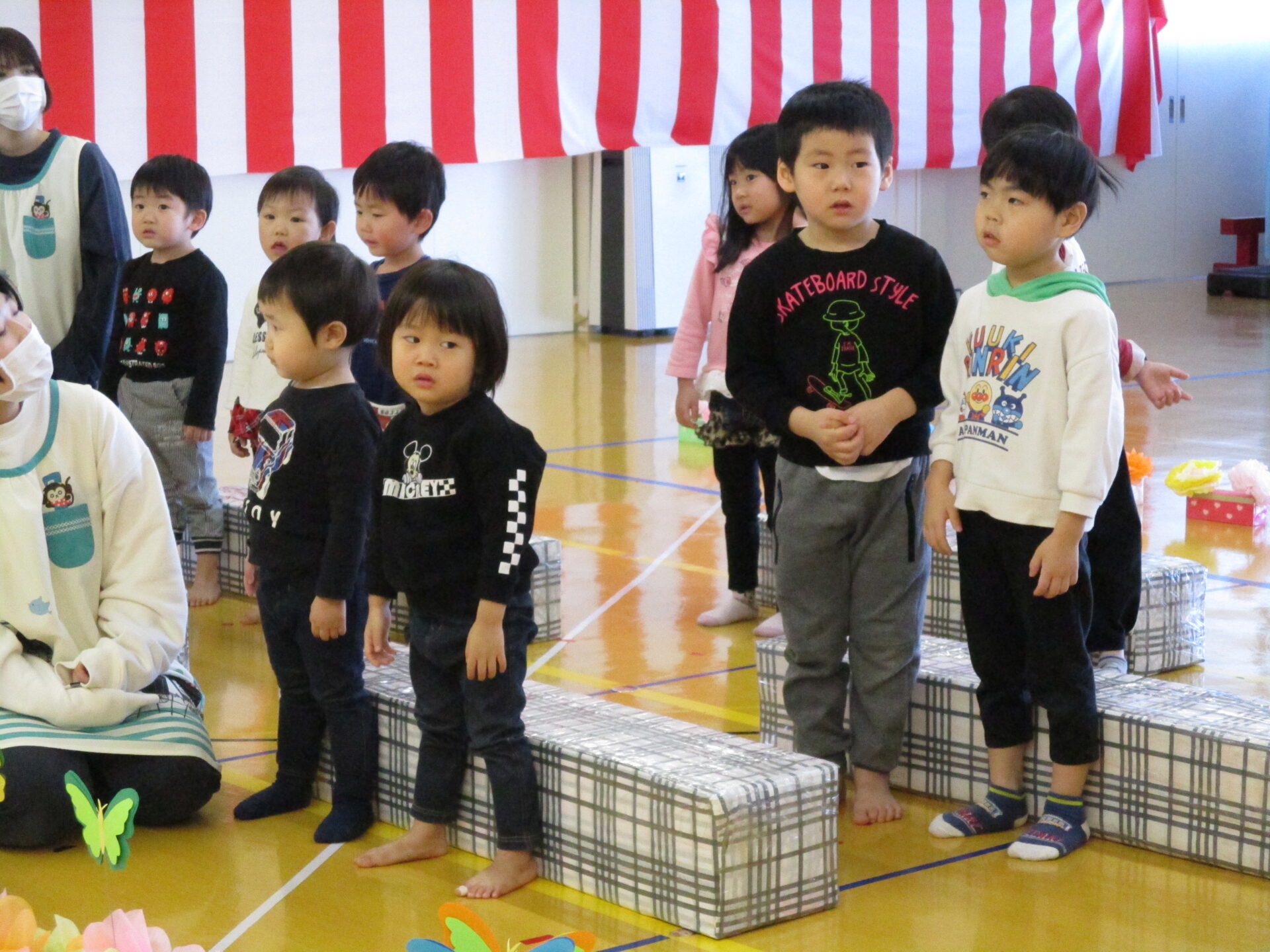 入園した園児は最初緊張ぎみでしたが、在園児のおにいさんの隣で一緒にうたを歌っていました😄
